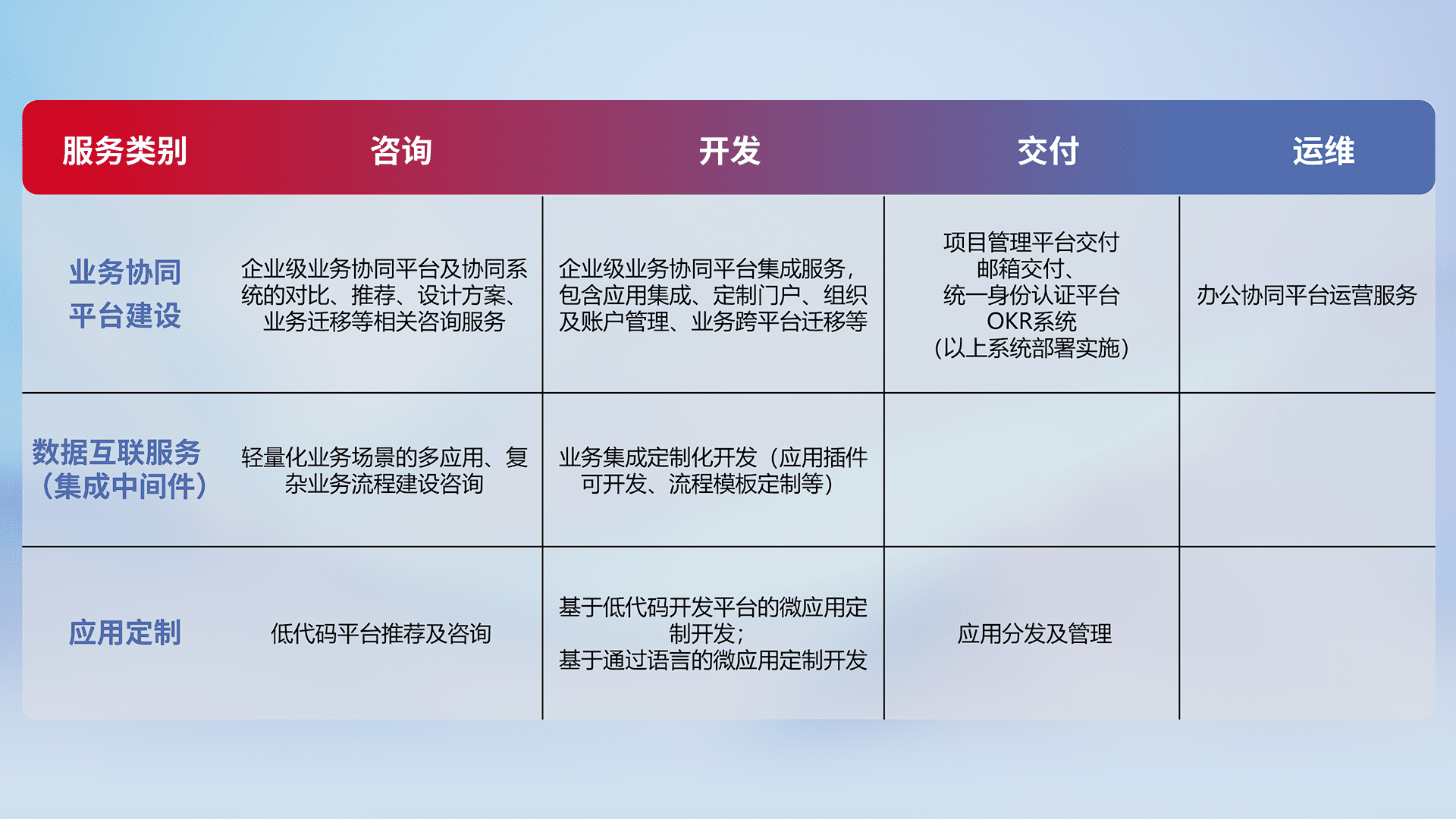 针对钉钉、、、企微、、IDaas等平台级产品提供产品的规划、、、方案、、交付、、、、定制化开发等服务,,,实现如统一协同办公、、、智能客户服务、、混合会议管理、、智能数据查询、、、等业务场景,,实现数字化转型。。。