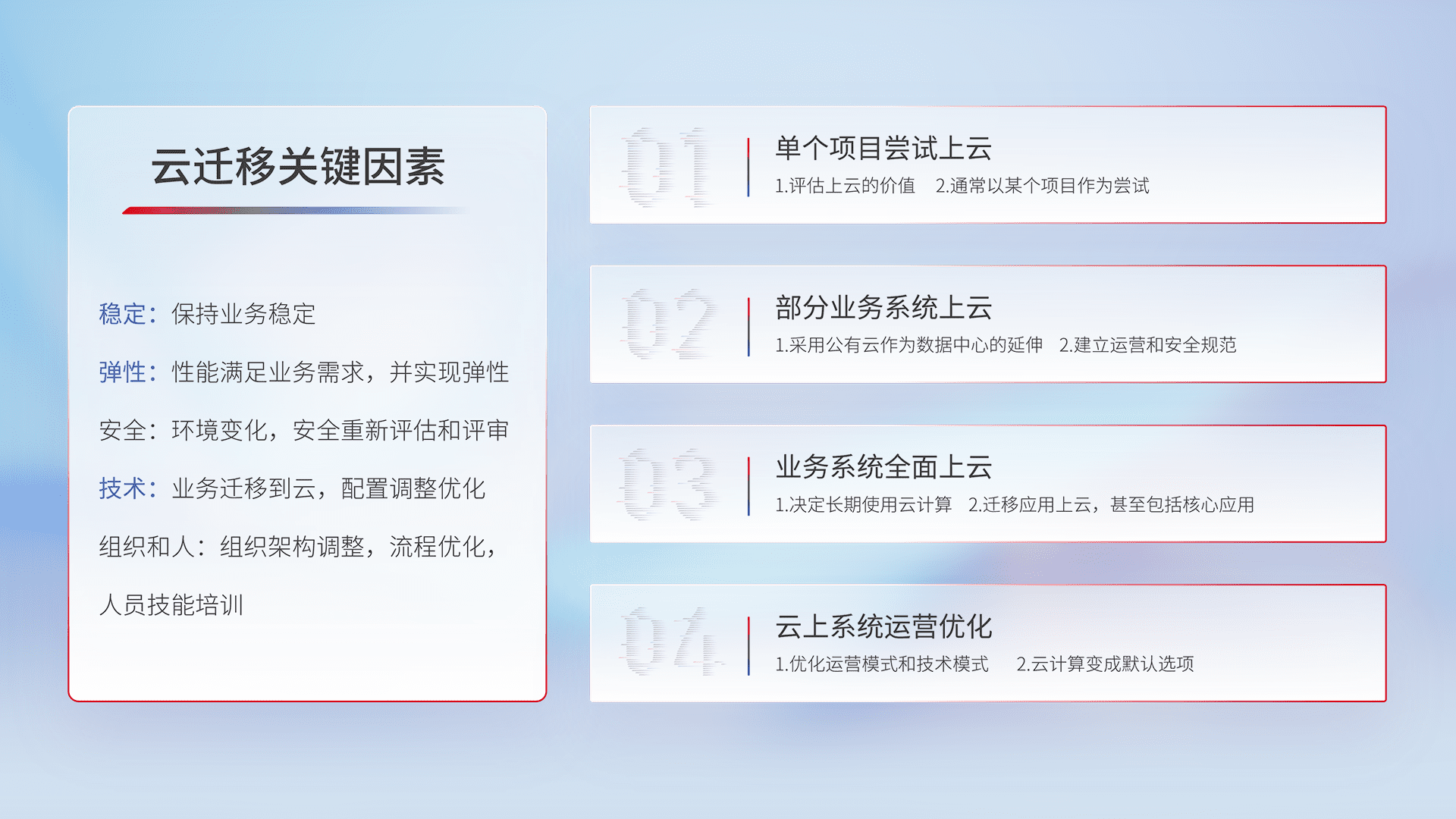 结合实际业务,,,从规划设计、、、云平台选型、、、云原生改造、、、数据迁移、、、、集成交付,,,迁移全过程为客户识别最佳上云路径,,,,做好风险识别管理,,设计网络架构、、、身份权限、、、安全审计合规、、、操作审计、、、日志审计、、监控告警策略、、、多站点容灾设计等,,,,对云上基础设施进行整体规划,,,提升IT治理水平,,,以满足弹性、、、、高可用、、、、高性能的需求。。。
