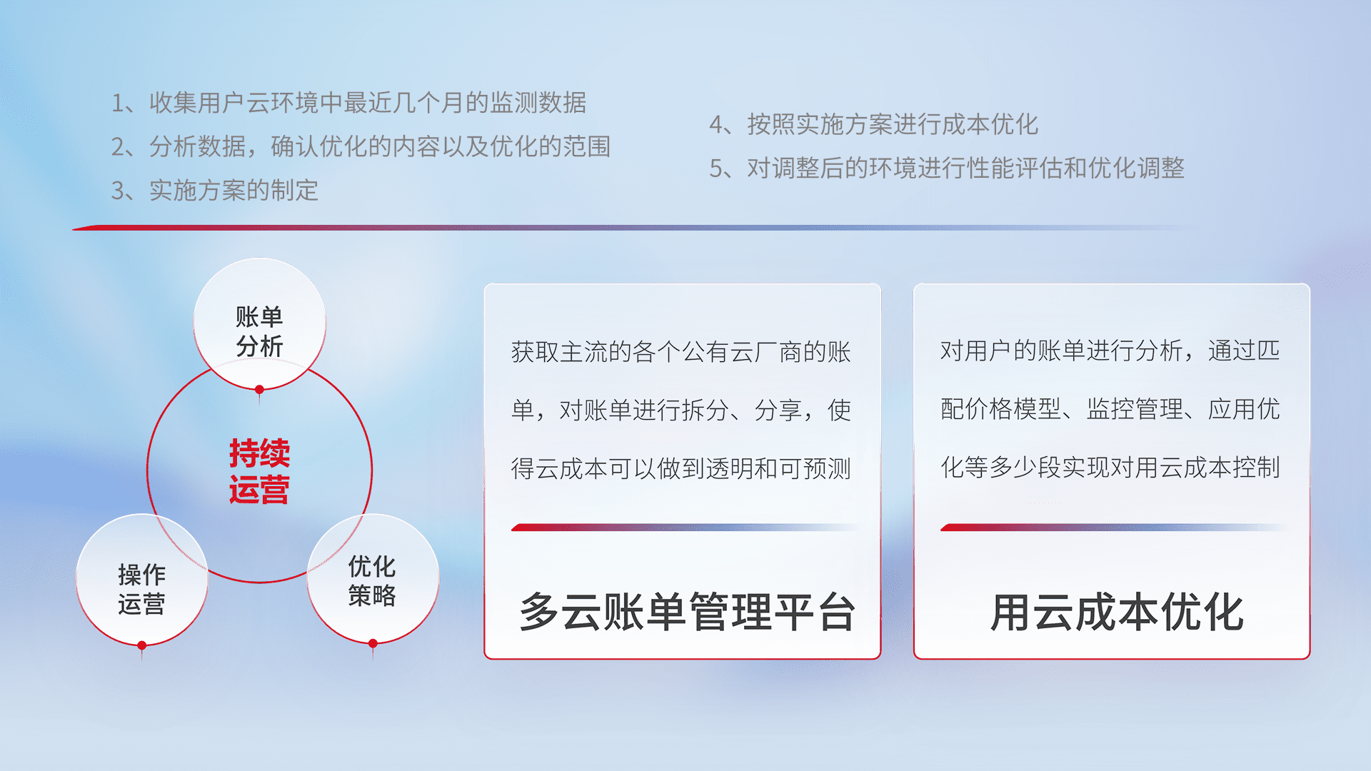 通过多云纳管,,,,以统一的资源数据模型把客户的云资源进行抽象和封装,,,进而实现对多云资源的统一操作,,保障云资源管理的可靠性、、稳定性与可用性。。。量身定制化运维内容,,配置、、开发运维、、、、补丁管理、、、备份、、、监控、、认证和访问管理、、审计和日常巡检等,,,保障在用云过程中的可靠度,,,稳定度以及高可用率。。。